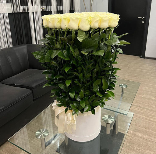 Modern, luxurious flower design in a box includes 75 white roses and greenery