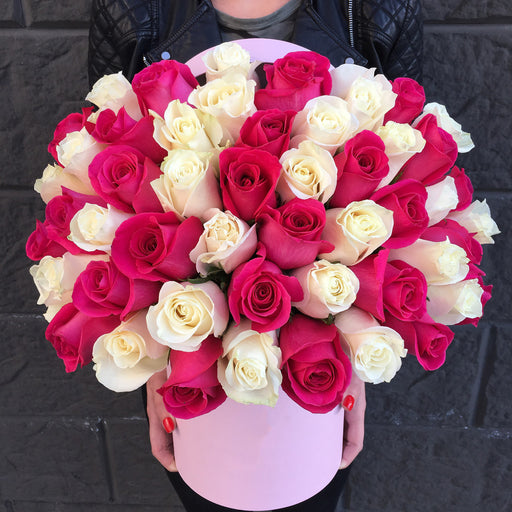 Stylish roses design with 50 50 White and Hot pink Roses in a box with lid on the back