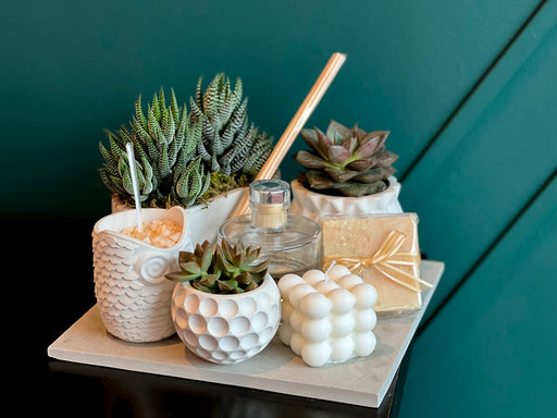 Stylish gift set with 3 succulents pots, candle, soap and fragrant oil. Excellent gift for any occasionArranged in cement tray ( 10x10 inch)