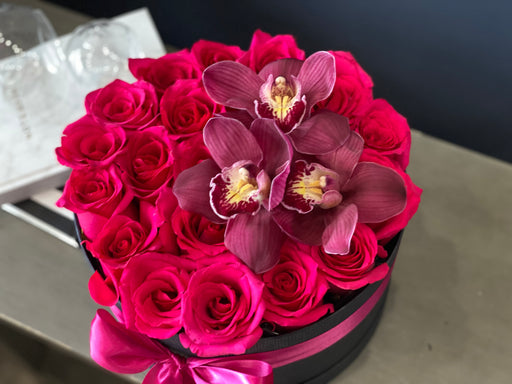 Up to two dozen fresh cut hot pink roses with cymbidium orchids accent.