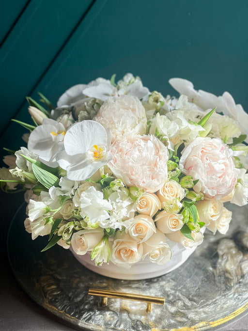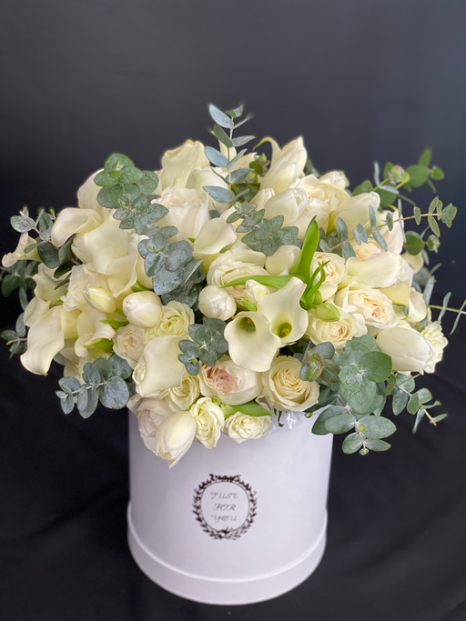 LARGE WHITE DESIGN IN A BOXMix flower design with roses, tulips, white mini calla lilies, spray roses in a box with greenery decor.