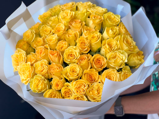 50 YELLOW ROSES BOUQUETBeautiful hand-crafted bouquet with 50 yellow roses in modern wrapping. Vase not included