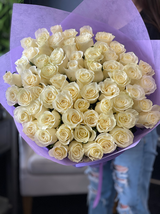 Hand-crafted Bouquet with 50 white roses. White roses arranged into one beautiful arrangement with modern paper wrapping. Vase not included