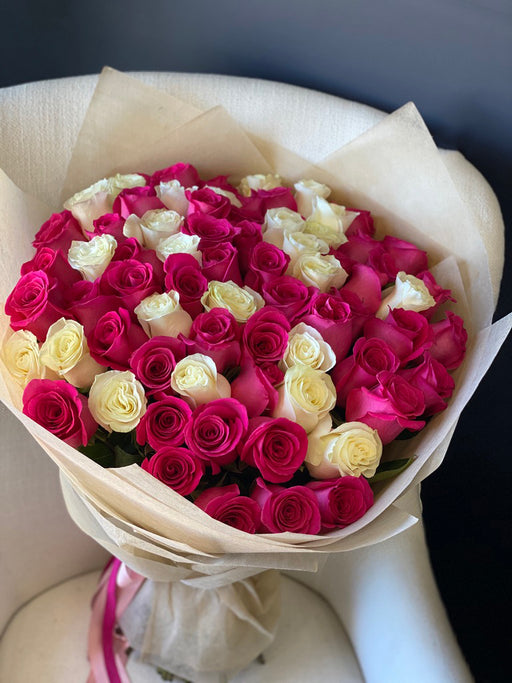 75 ROSES BOUQUET. WHITE AND HOT PINK ROSES BOUQUETVase Not included