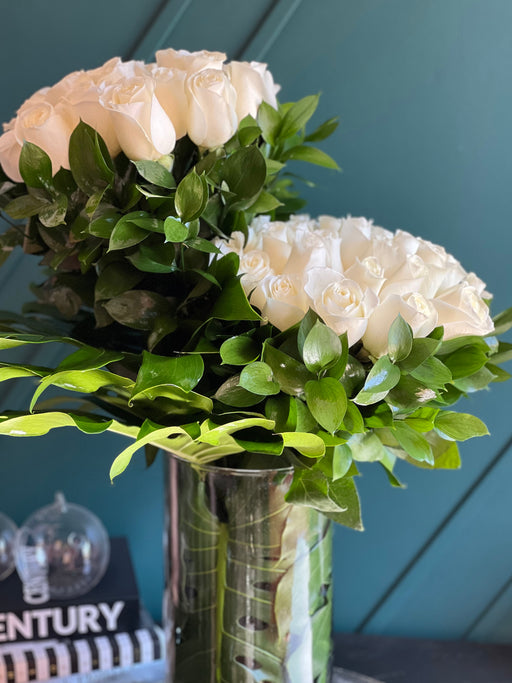 50 WHITE ROSES ARRANGEMENT Tall modern design with 50 white roses in a vase with monstera leaves and greenery.