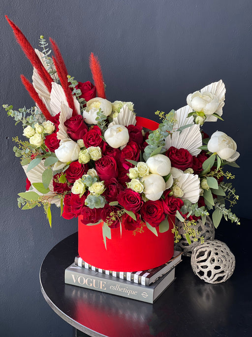 A CLASSIC ROMANCE | BOX WITH FLOWERS | MIAMIBoxed design in red and white colors. with roses, spray roses and peonies, greenery with dry leaves acc...
