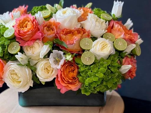Product Description BRIGHT MORNING | FLOWER DESIGN IN VASEThe pretty orange and white roses with hydrangeas, limes, and seasonal flowers were lovel...