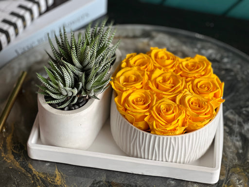 Gift Set with yellow forever roses and succulent. Arranged on custom made tray
