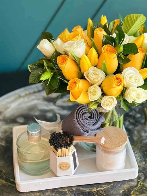 Gift set with fresh cut flowers in a vase ( roses, spray roses, tulips), candle, fragrance diffuser, small towel and matches. Arranged on custom ma...