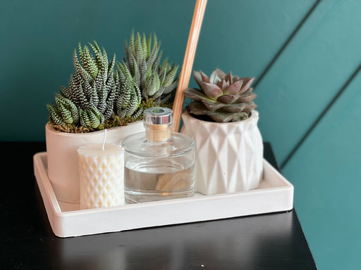 Custom made cement tray with 2 pots of succulents, candle and fragrance diffuser