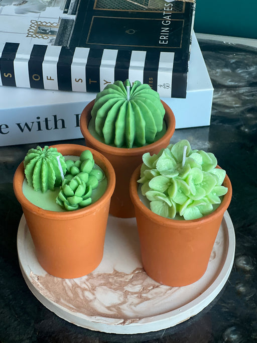 Set of 3 handmade candles. Cactus candles. 3 candles pot arranged on 6" cement tray. Scented candles. ( 2" width and 4" tall - each pot)