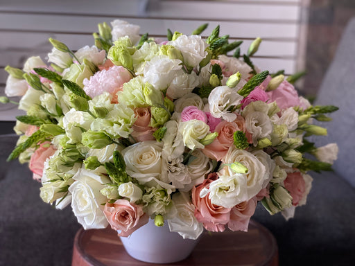 CHARMING TOUCH | MIXED FLOWERS IN CERAMIC VASECeramic vase with mixed flowers. Includes: roses, alstroemerias, peonies, ranunculus, lisiathus, gre...