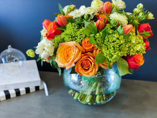 Delight – Mixed Vased Flower Arrangement with Tulips, Roses & Seasonal Greenery Bring joy and timeless elegance to any space with Delight, a be...