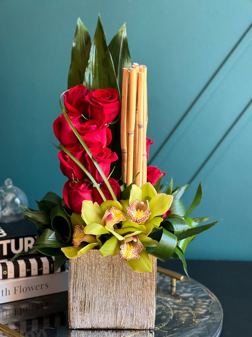 DOZEN FRESH-CUT RED ROSES AND ORCHIDS IN A VASEDozen red roses and cymbidium orchids with decor in a vase
