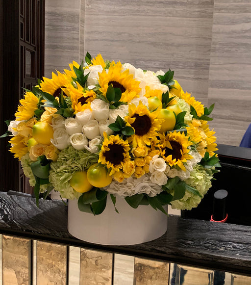 XXL BOX WITH ROSES, SUNFLOWERS AND FRESH LEMONSA stunning, classic, and bright flower arrangement in a boX makes your love in their heart unforgett...