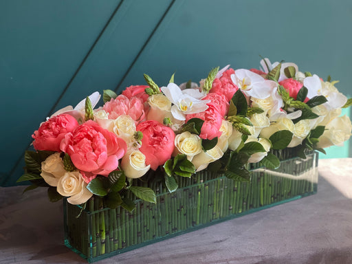 Peonies & Orchids in Clear Cube Vase – Elegant Compact Floral Design Soft and sophisticated, this chic floral arrangement blends the timeless...
