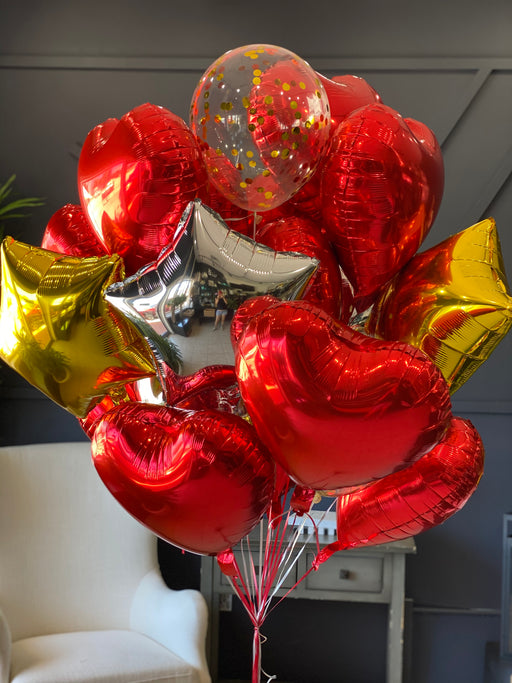 Two Dozen Balloons Bouquet. Red Heart-Shaped Balloons, Silver and Gold stars and confetti latex balloons bouquet