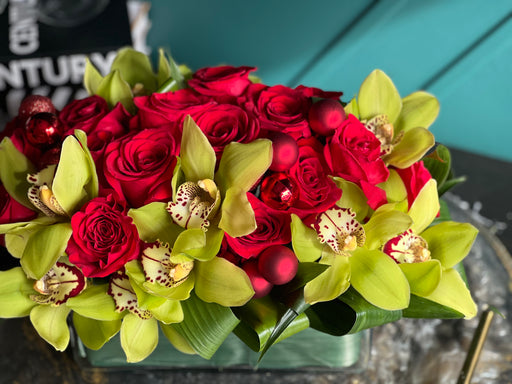 Beautiful Christmas centerpiece with red roses, cymbidium orchids and Christmas decor