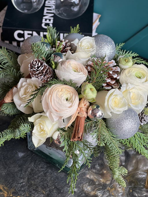 Beautiful Christmas centerpiece in white colors. Arranged in clear cube vase. White roses, ranunculus, cinnamon, pines and Christmas decor.