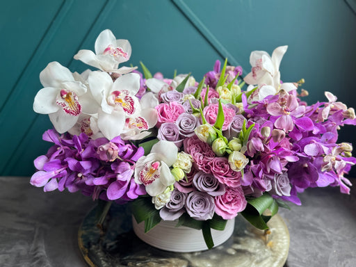 Product Description RED ROSES AND ORCHIDS IN A BOX This exquisite red roses and orchids arrangement displays a perfect harmony of color and design,...
